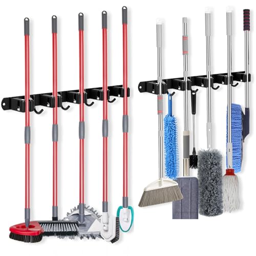 Specification: voze [2 Pack] 5 Racks and 4 Hooks Mop and Broom Holder Wall Mount, Self Adhesive Heavy Duty Broom Organizer Storage Tool Racks for Kitchen Garden Laundry Garage Black