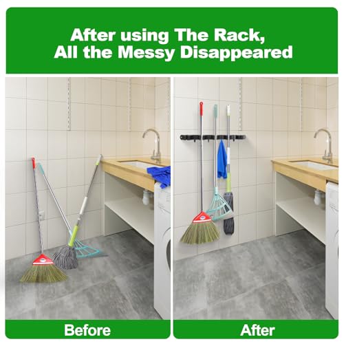 [Organizing & Saving Space] Keep your garage or laundry room organized and tidy immediately after the usage of this broom and mop organizer wall hanging, it is designed with 5 slots and 4 Hooks/ hangers and can organize your brooms, mops, rakes, garden or garage tools and other accessories, your entire tools would possibly not disorderly stacked on the ground or in a corner of your house, save great space.
