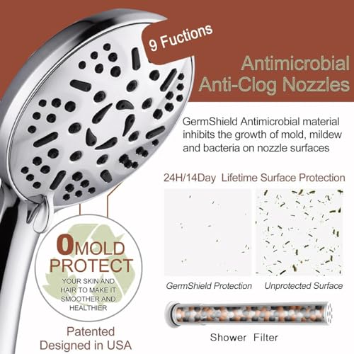 9 Modes High Pressure Handheld Shower Head with Hard Water Softening Filter to Remove Chlorine and Other Compounds, Reduces Dry Itchy Skin, Includes Hoses