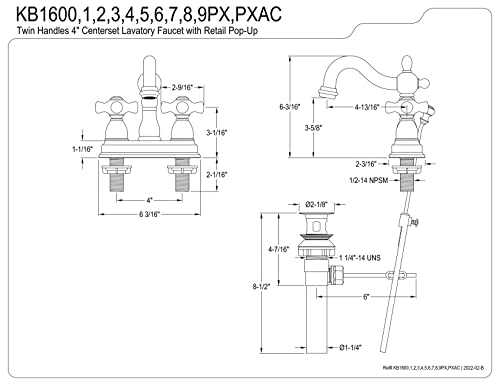 Specification: Kingston Brass KB1602PX Heritage 4-Inch Centerset Lavatory Faucet with Porcelain Cross Handle, Polished Brass