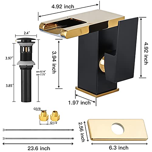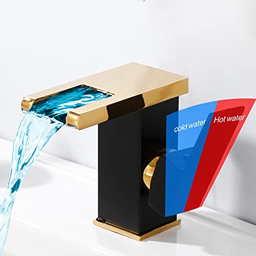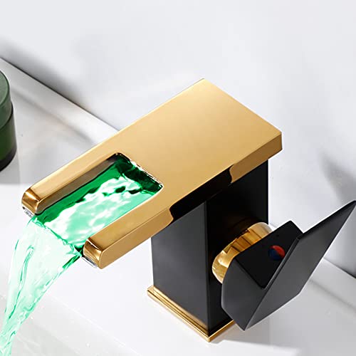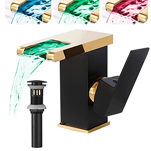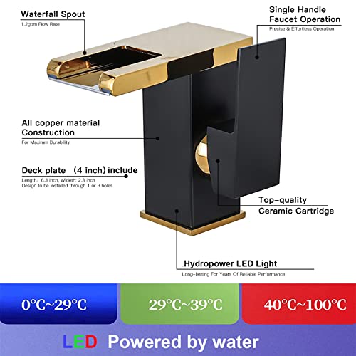 Specification: Waterfall Bathroom Faucet Black&Gold Led Light 3 Colors Changing Spout Single Handle Lavatory Vanity Sink Faucet One Hole Matching Pop Up Drain with Overflow Bath Basin Deck Mount Commercial