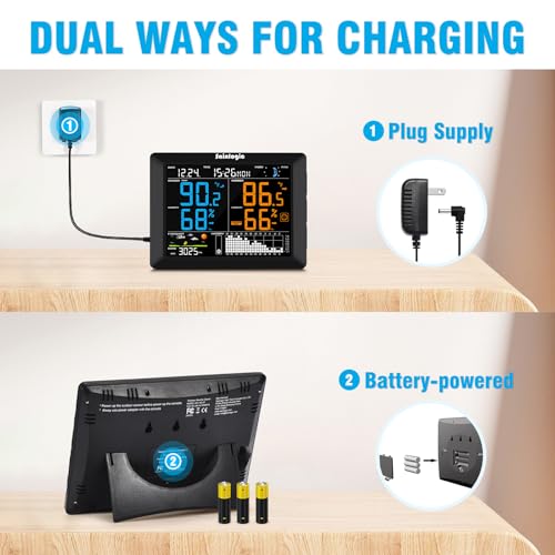 𝐄𝐧𝐡𝐚𝐧𝐜𝐞𝐝 𝐃𝐢𝐬𝐩𝐥𝐚𝐲:The weather thermometer features a large color display with vibrant color matching and rich content. It provides clear readings of indoor and Outside temperature, humidity, weather changes, atmospheric pressure index, moon phase, yard clock, date, comfort indicator, and temperature alarm, among others.